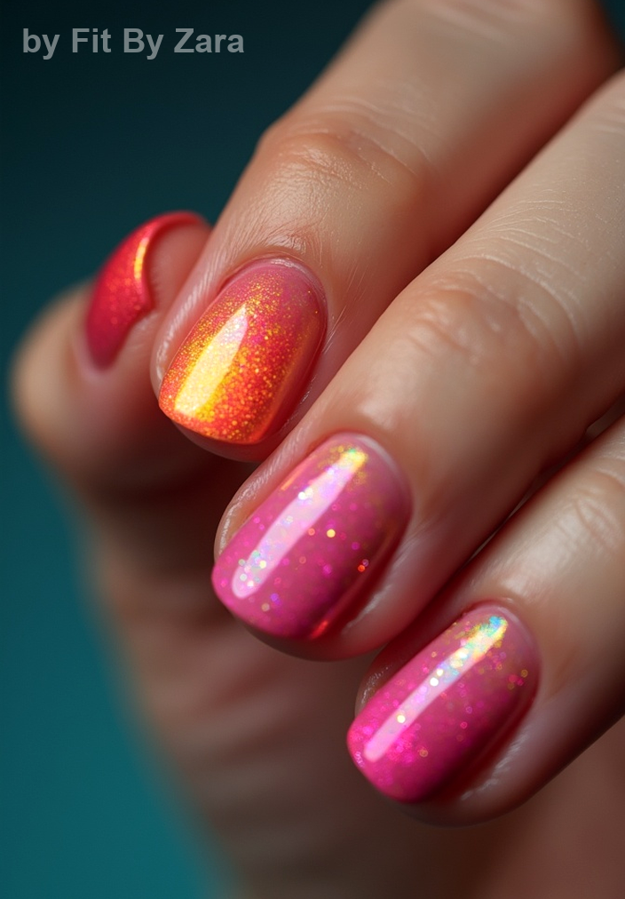 Picture the soft hues of a summer sunset melting into one another on your fingertips. This sunset ombre effect seamlessly blends shades like peach, coral, and a delicate lavender. It whispers warmth and joy, giving your nails an ethereal glow. The gradient creates depth, making fingers appear longer and more elegant, perfect for those sun-soaked days.